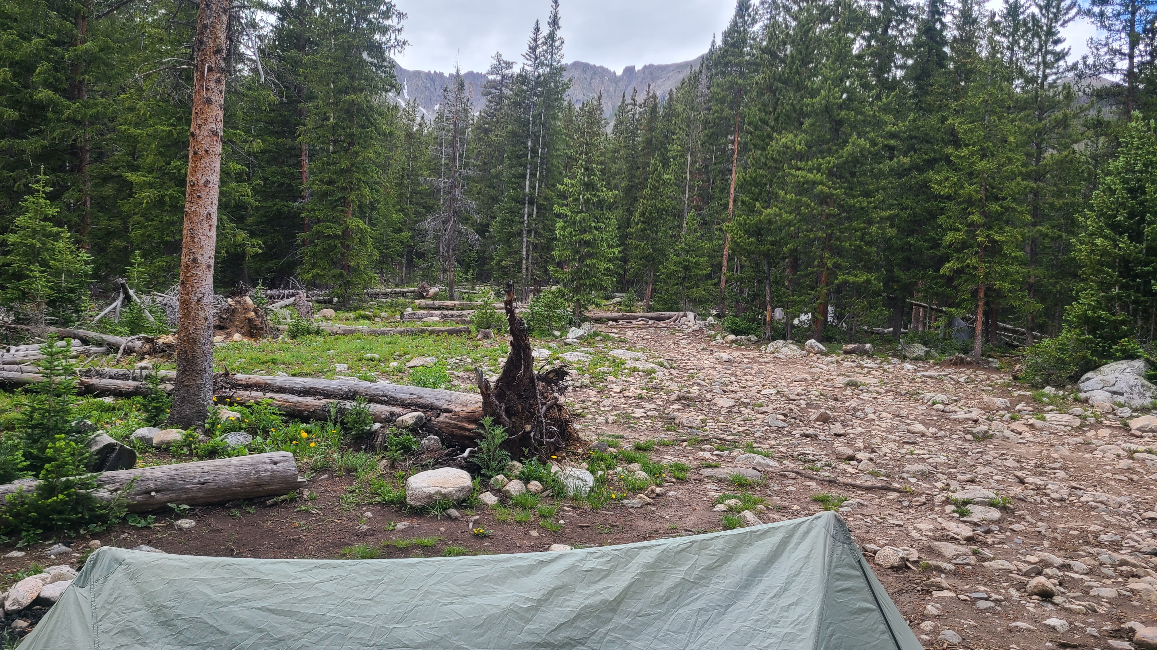 Erica dropped me at Kenosha Pass and not long after starting my hike nature called me to do some business off trail. I had spotted a tree far enough away from the trail to use as a landmark, but when I finished I spent probably 20 minutes finding my way back to the trail. I was still pretty new at this; my Guthook app let me know the trail was close by but I just couldn’t see the it. From that point on whenever I walked off-trail I took a quick compass bearing of my direction of travel off-trail from my Instinct watch, and also pointed my poles back towards the trail when I stopped. I was a bit frustrated knowing I was short on time with the impending storm. I had hoped to hike at least 10 miles that day, but only made it around 6 miles to Jefferson Creek when the rain started. The rain got heavy right as I crossed the road, and I decided to make camp at the next decent site. I found an established spot right away and thankfully stopped there as the rain continued for several hours that afternoon. I was especially happy to have stopped when I could hear thunder and see the lightning flashing up the hillside on the next day’s climb. Thankfully my Xmid tent kept me dry overnight.