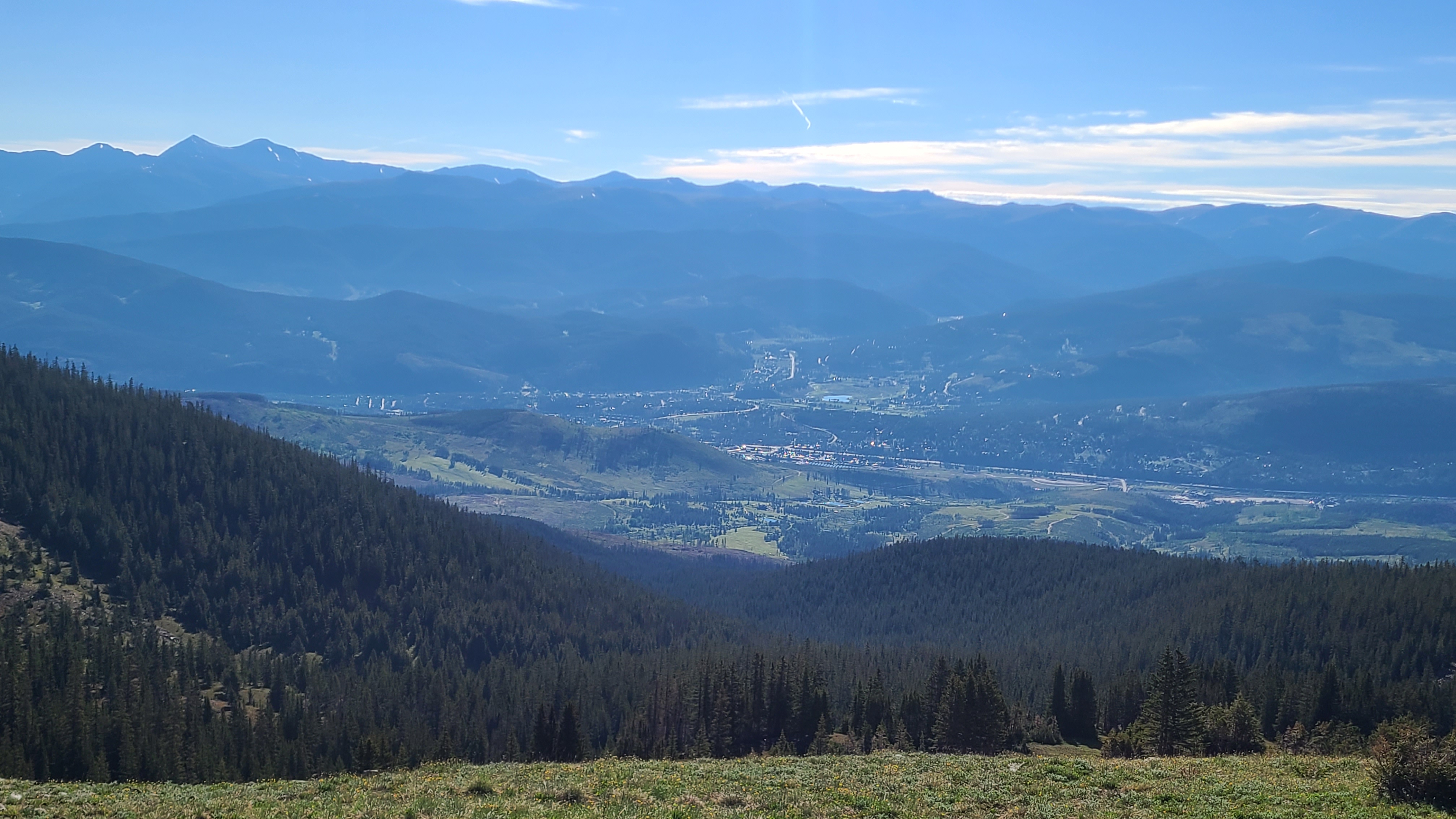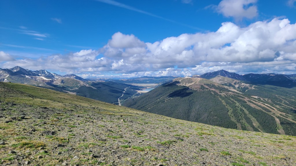 I could then see Breck down below as continued up toward the top of the ski area. This was not easy hiking, but the worst was behind me and the views were simply spectacular. I met a woman hiking with her dog as I crossed over the Tenmile range who had been hiking between Copper and Breck daily every hiking season for the past 20 years. The trail wound its way though a rocky field on the ridge, and I wondered where the hikers on the next higher peak were headed. As I started down I saw one of them sprinting hard down the steep hillside with a hang glider on his back then take off, somehow managing to avoid dragging his body on the ground by a foot or less.