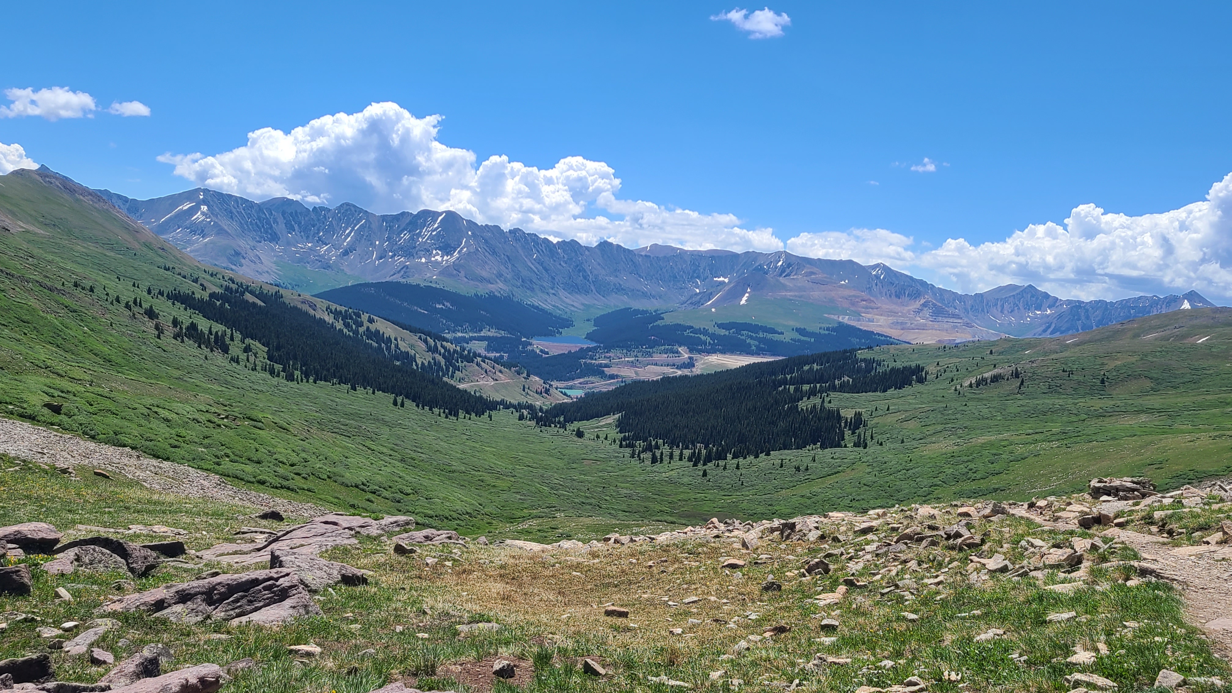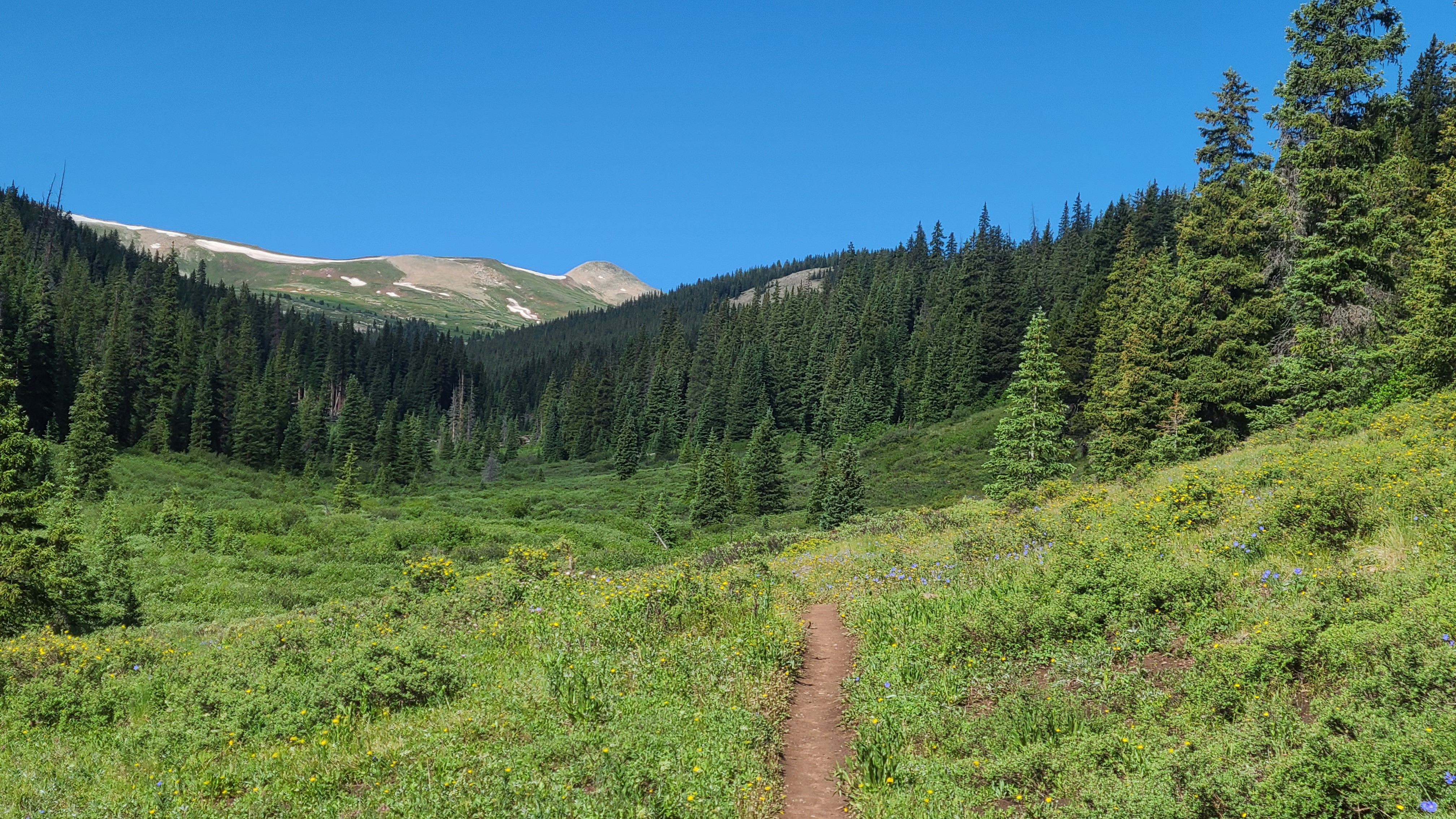 I started this trip on July 6 to avoid the holiday crowds, and had stayed with my son in Leadville the night before. I left my truck at Erik’s house and caught the Lake County Link shuttle to Copper at 5:30 am. My plan this trip was to complete the 25 miles from Copper Mountain to Tennessee Pass in 2 days. I knew that most of the 4400 feet of total elevation gain would be on the first day and it helped to get an early start. The bus dropped me off near Copper and I hiked back to where the CT connected along Highway 91.