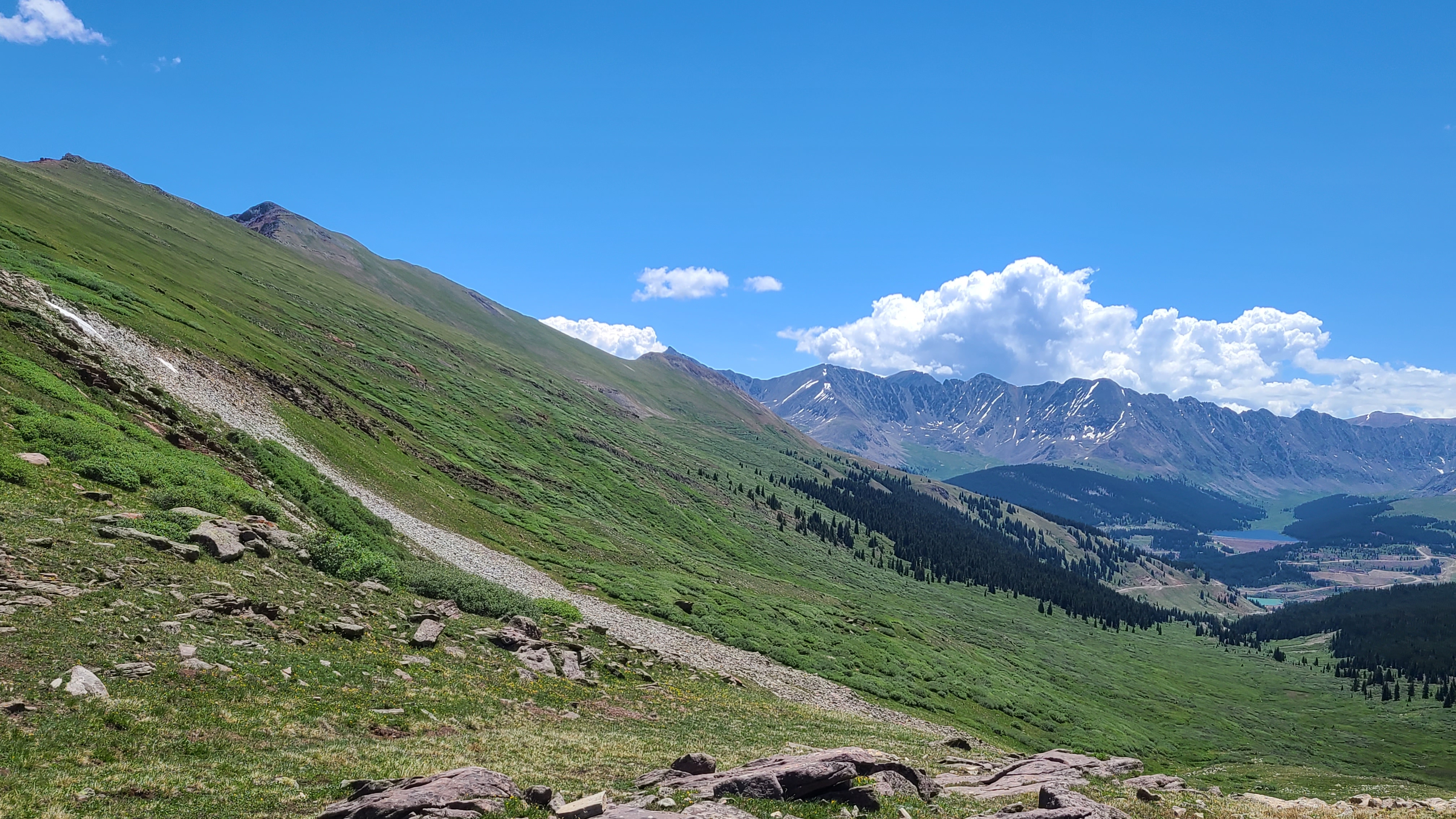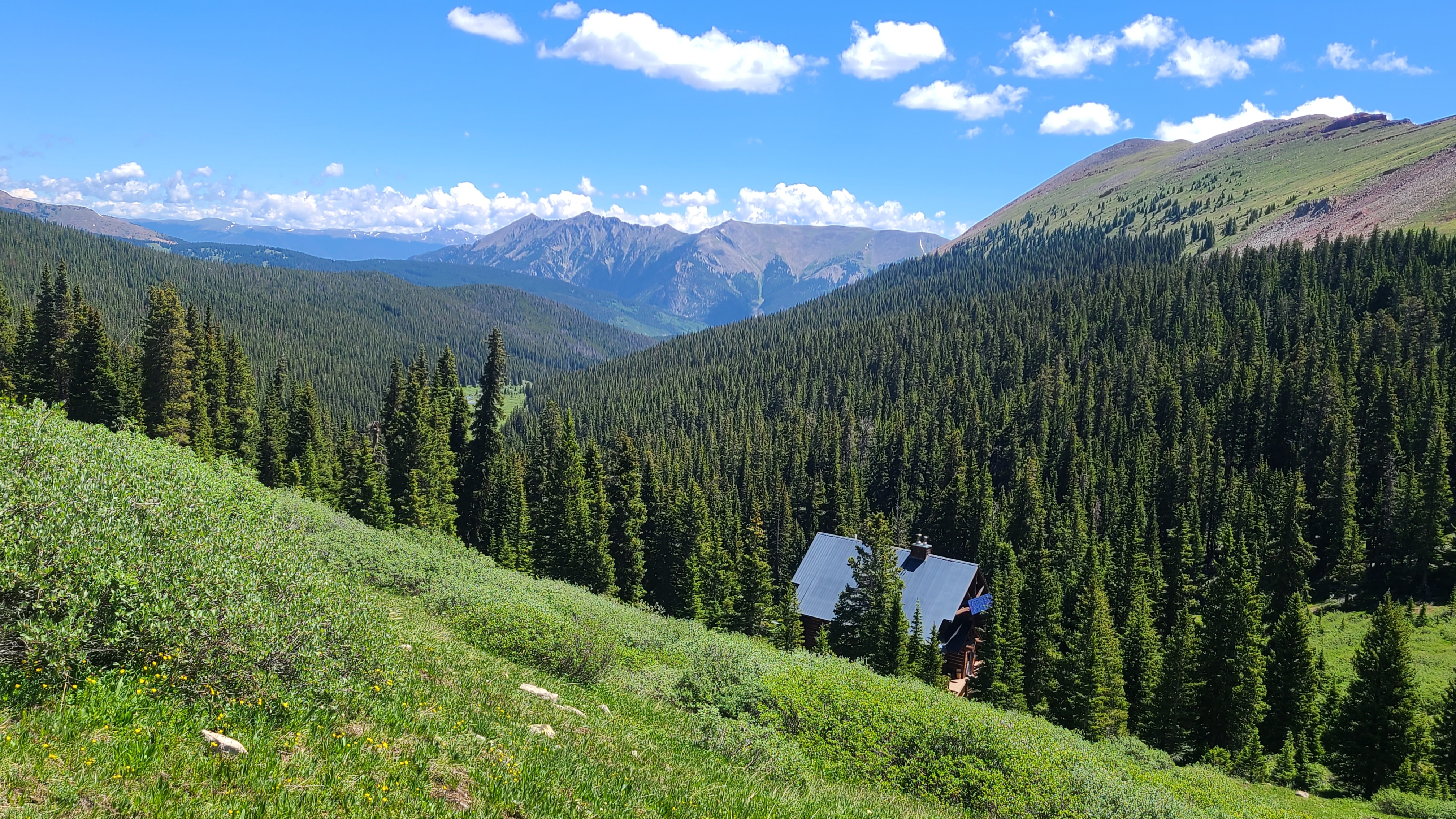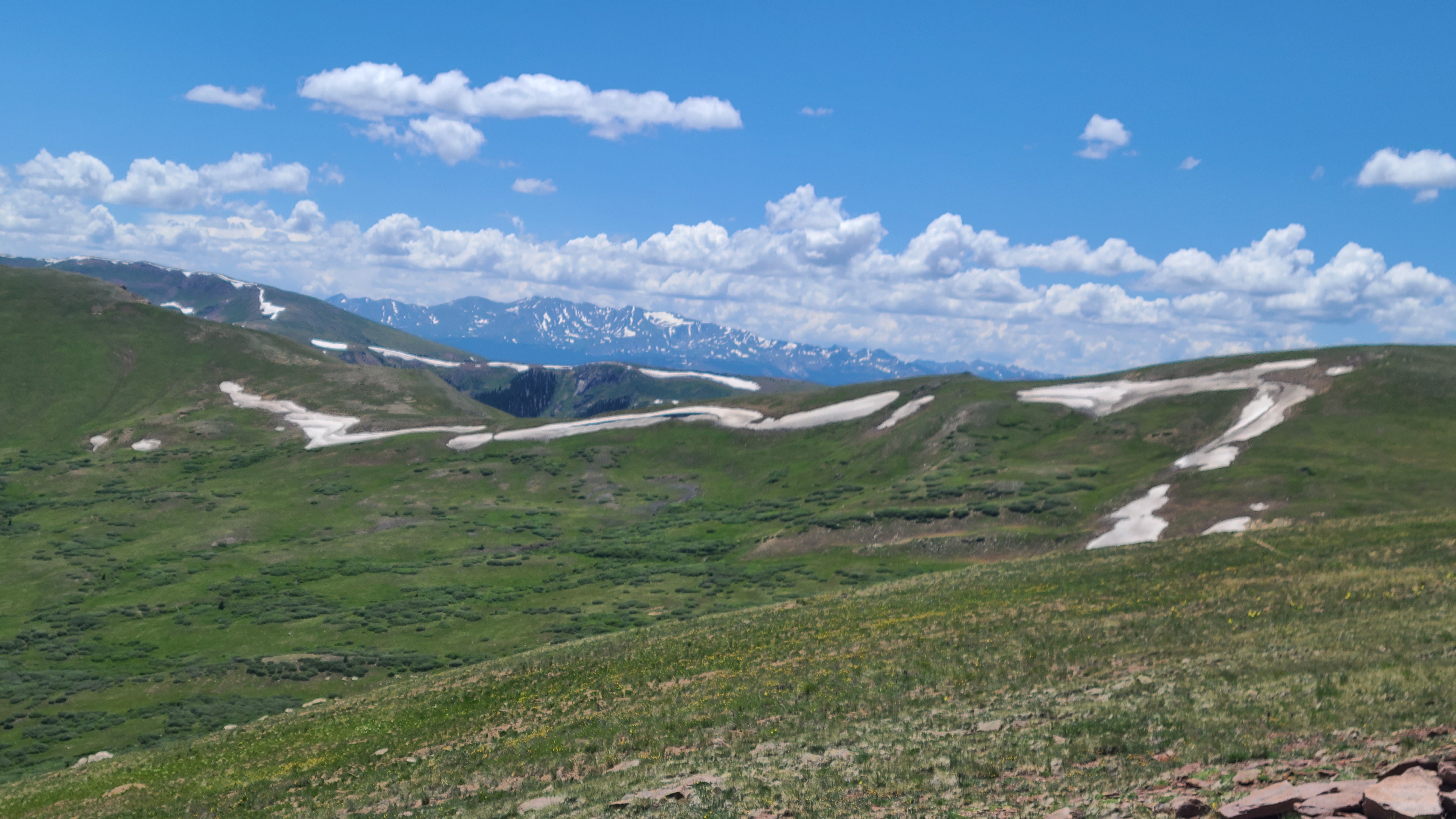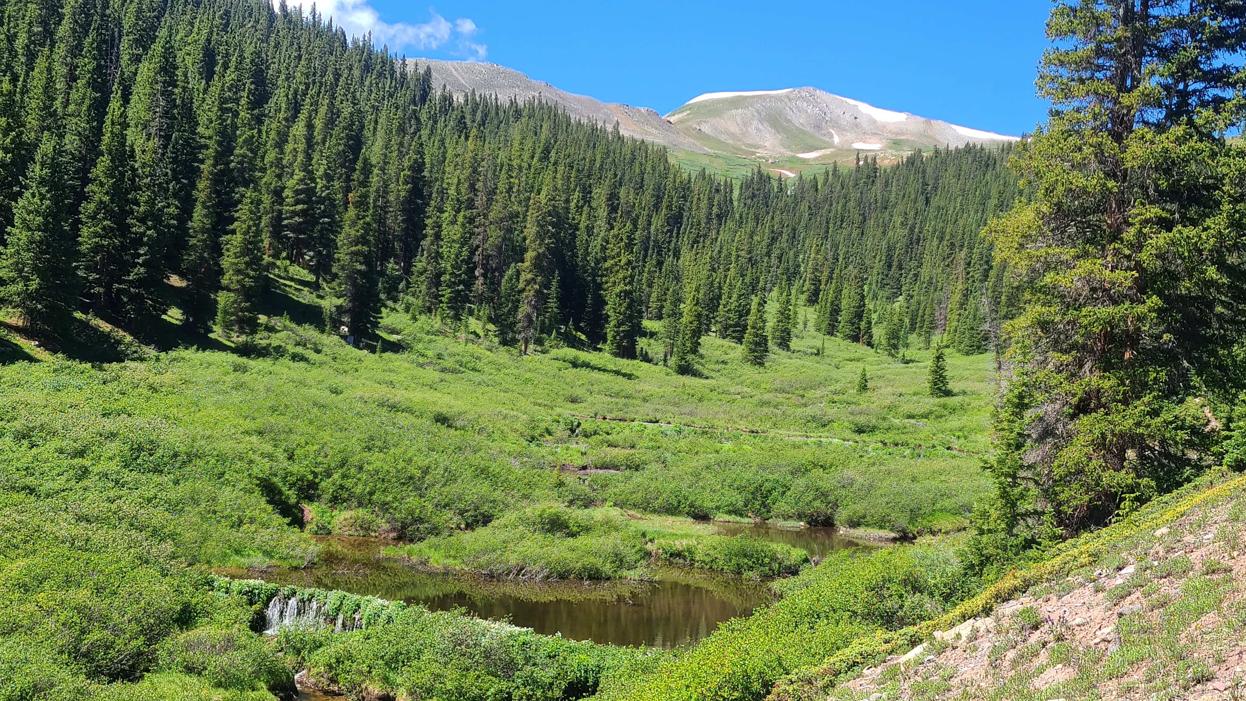 There were a few mountain bikers out today, and several let me know the view up ahead would easily make the climb worth it. The trail gains 2400 feet over 12 miles, not steep but a relentless climb. There was pretty run-off creek flowing down Searle Pass along the way. A friend had told me about a hut trip he had taken to Janet’s cabin, and it looked like pretty special place looking down from the pass. I finally made it up over Elk Ridge and despite the wind I took a few minutes to enjoy the views all around me. Even the Climax mine with it’s filtering ponds and Highway 91 in the distance added to the scene. Now, whenever I drive over Fremont Pass, I can look up from the highway towards this notch I passed through that day and remember what it was like to be all the way up there.