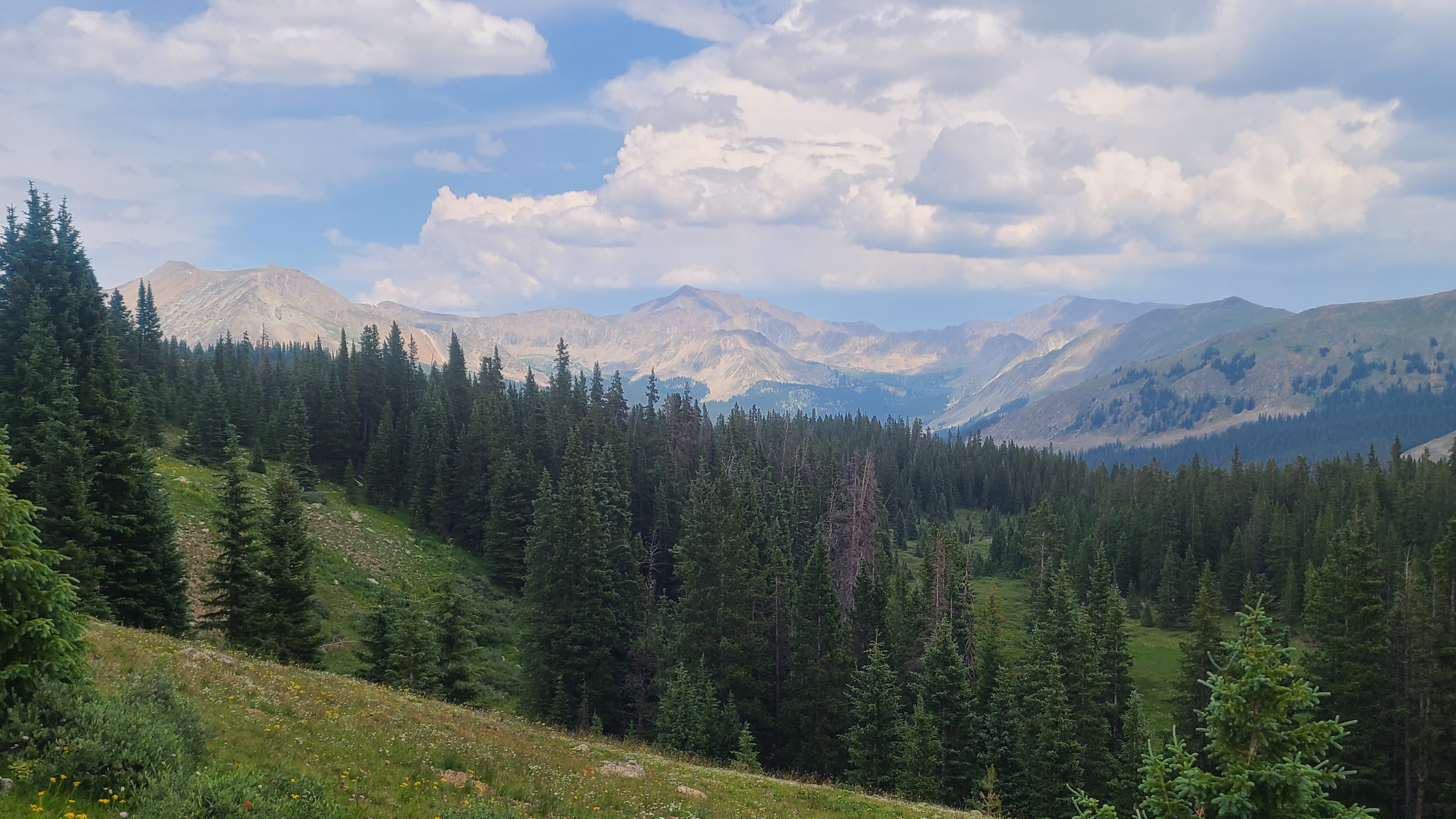 It was early afternoon at this point, and the skies were turning grey. I could see the steeper climb up the saddle and began to hurry my pace. The rain was not yet heavy, but I could hear thunder and lightning was flashing on the horizon. The meadow towards the saddle was pretty much unprotected and I watched the 3 other hikers moving fast and further ahead of me. I was surprised to see 2 of them leave the ridge and dash back down into the meadow as one continued up. I was worried that maybe they knew something I didn’t, but I kept climbing up then onto the ridge as I could see the lightning getting closer and closer. I also noticed that my tired legs were not so tired anymore as my adrenaline kicked in. Once on the ridge I could see the cars and parking area on Cottonwood Pass below as the trail continued further along the windy ridgeline than I had hoped.