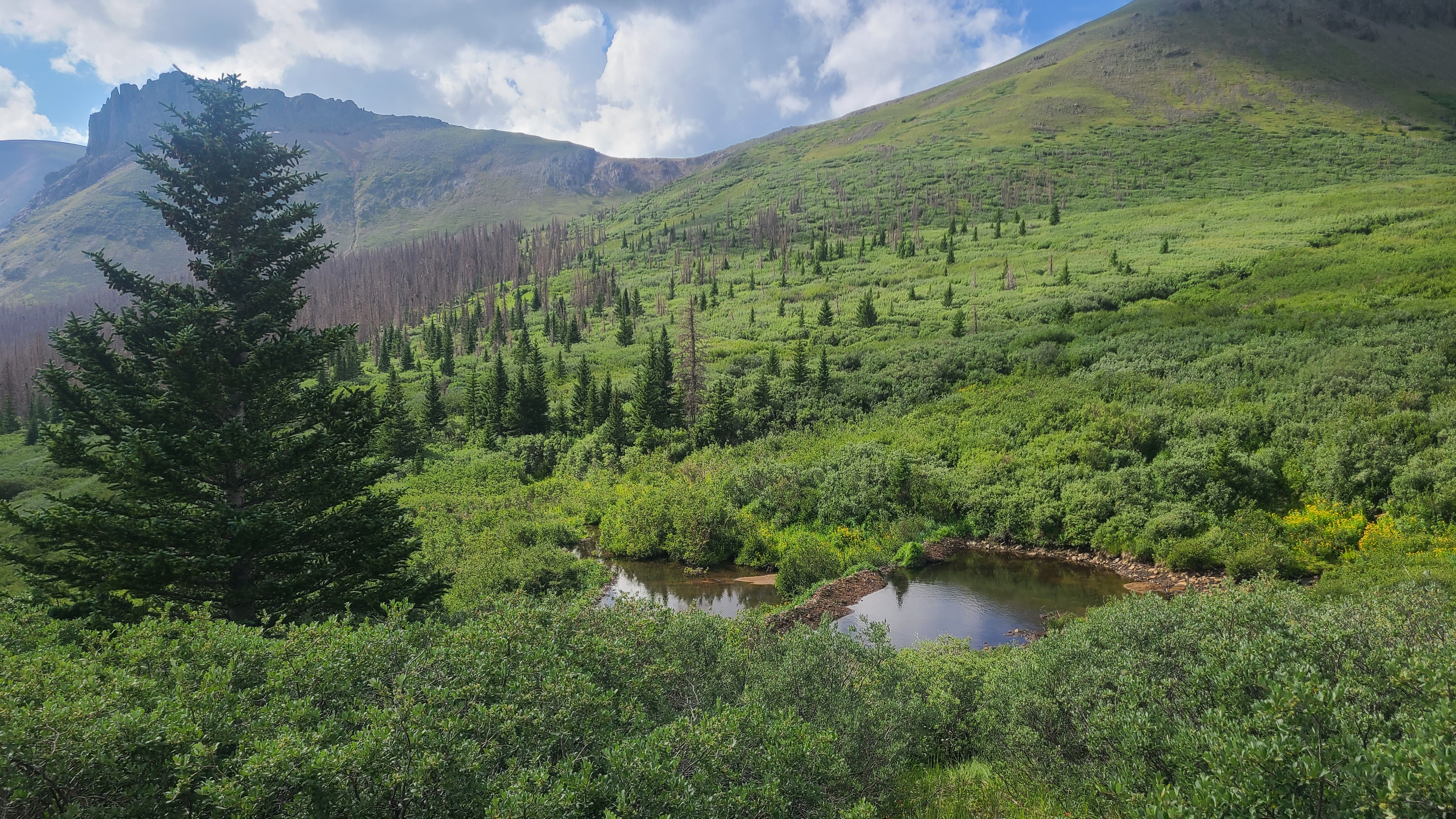 I was up and out of camp before daylight. expecting some challenging climbs today after a couple days of easier going through Cochetopa. After about 3 miles and a short climb I passed some other CT hikers breaking camp alongside a scenic creek; I complimented them on finding a much better site than I had settled for with the cows the night before. I was climbing out of a lush drainage with pretty beaver ponds and crossed back & forth over a stream until I reached a series of switchbacks.