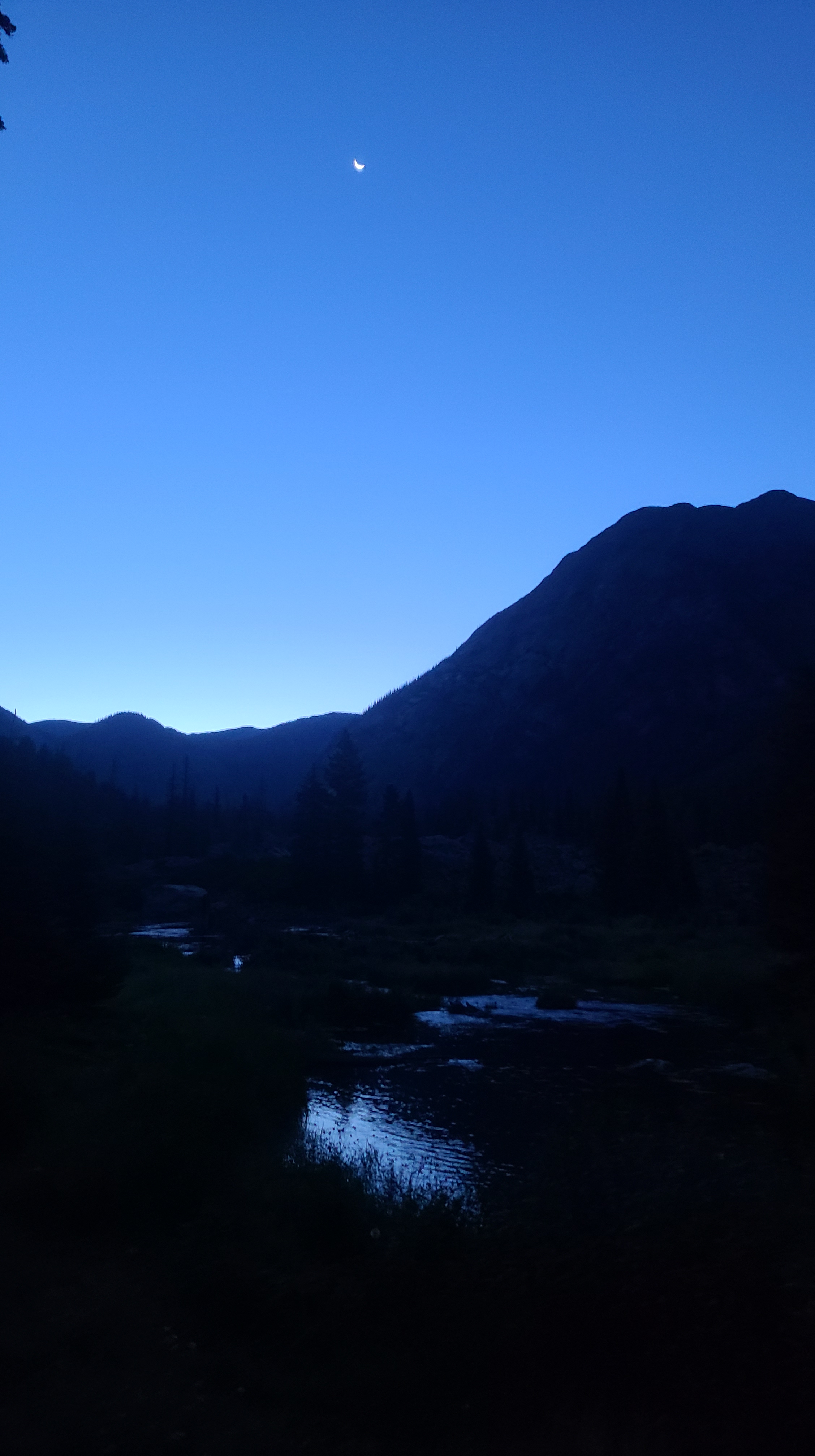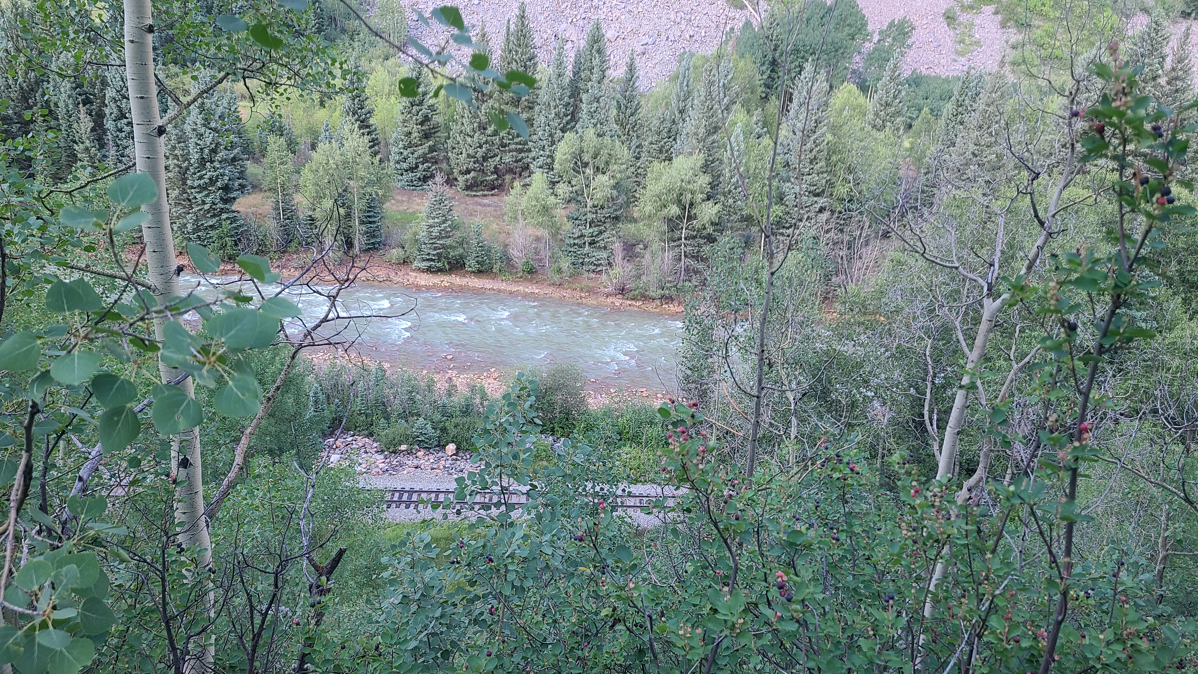 I kept my habit of leaving camp before daylight, and could see peaks behind and a crescent moon above a scenic beaver pond I passed by just before sunrise. I dreaded the long descent ahead as I knew that meant a big climb would soon follow. At the bottom of the drainage the trail crosses the Animas River and the train tracks for the Durango to Silverton Narrow Gage. More than 30 years earlier I had taken the train with my friend Bill for a backpacking trip into the Chicago Basin.