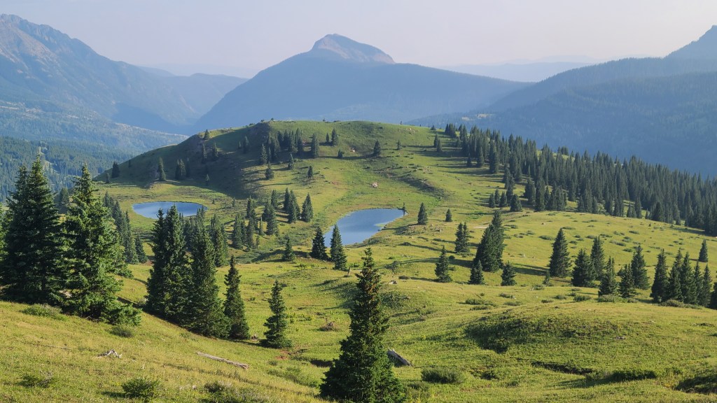 Not long after getting back on trail we came across a trail magic canopy hosted by a prior CT hiker called Tink and her husband. It was Tink’s birthday and they had celebrated a year earlier at the same site. We were joined by Toyota and Sunshine, who I had met earlier, then a fun trio of hikers called Flame, Waves, & Gadget. Kinnikinnick and I hiked on for about 5 more miles as we discovered we keep a similar pace. Despite a bit of wildfire haze, the naturally landscaped hillsides we hiked past were right out of a painting. We camped well above a pair of small lakes that were too pretty to disturb with a campsite. I didn’t get a picture but I’m sure the scene of our side by side Xmid 1p & 2P tents above the lakes would have made their designer Dan Durston proud.
