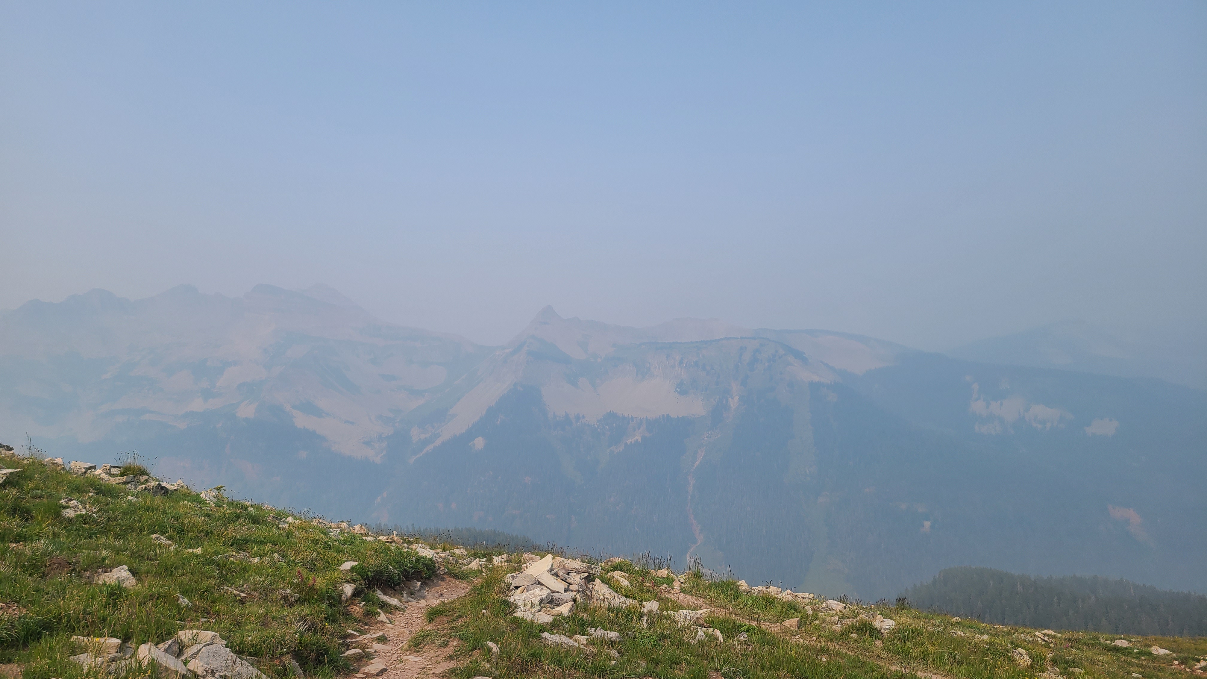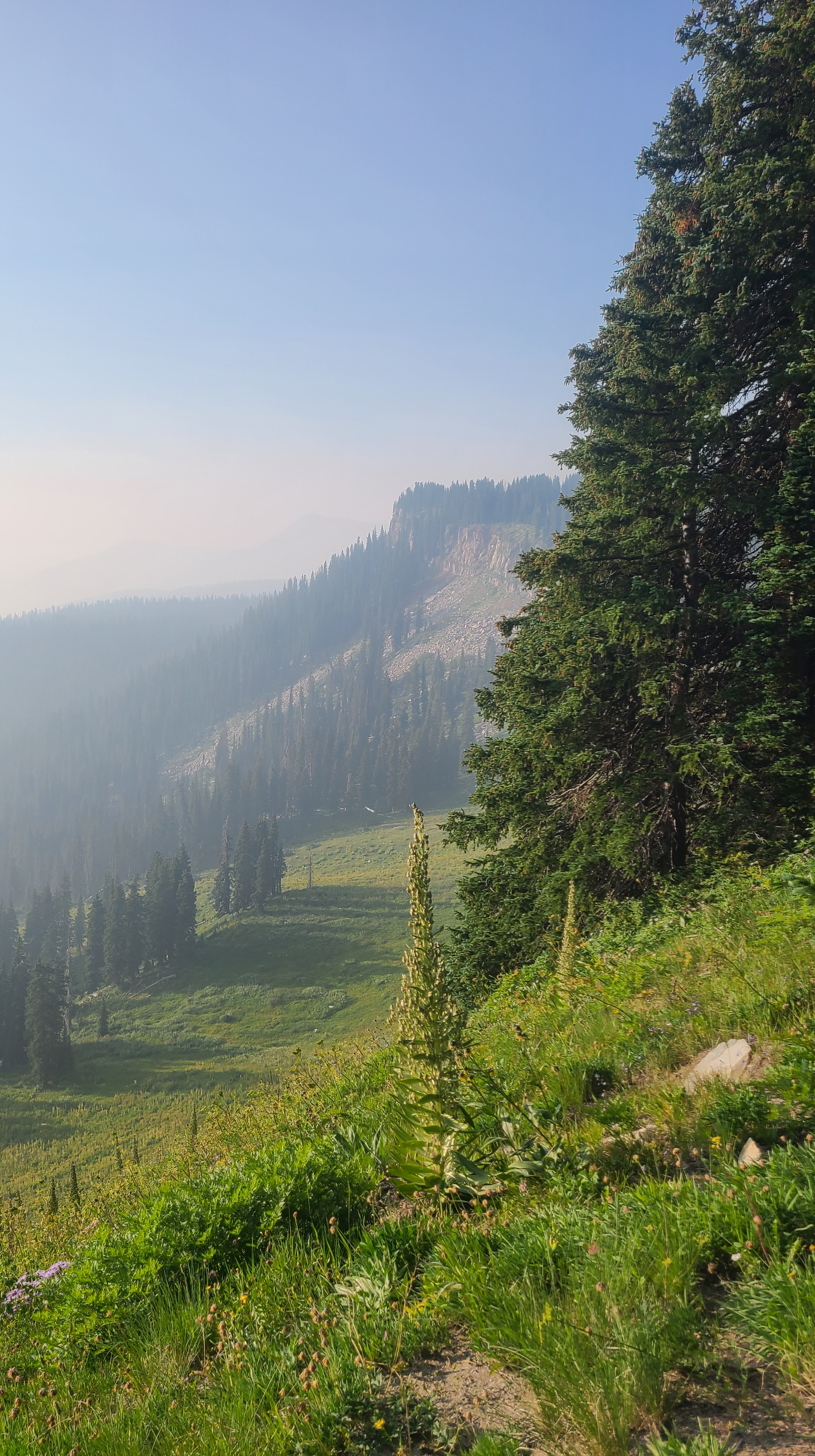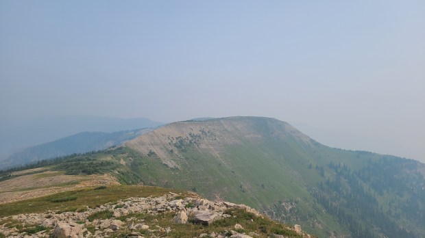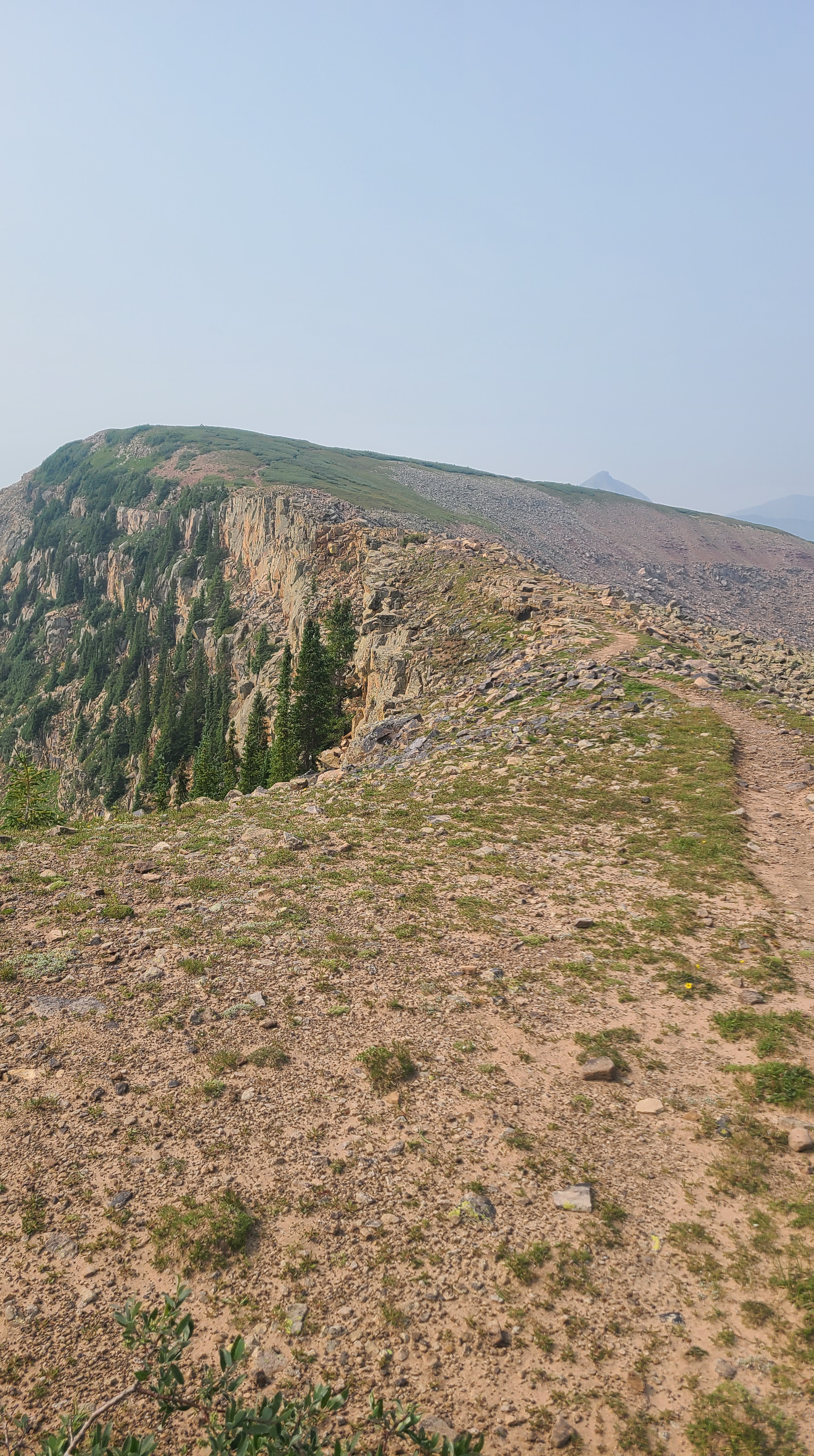 I had seen the trail markers as I hiked into camp the night before, but hadn’t put it together that Silverton Ultra runners would be passing just a few feet from my campsite in the wee hours of the morning. I used that as my excuse to sleep in a bit, and it was already daylight before I got out of camp. I had heard lots of warnings to beware of storms on Indian Trail Ridge, but I was just 5 miles from the start of the climb and the skies were filled with wildfire haze rather than storm clouds. The Colorado Trail had shown me an impressive collection of mushrooms, but I had never seen anything like the odd yellow cauliflower-looking mushroom I passed on the way to the ridge. The wind was blowing hard across trail as I reached the rockslide switchbacks; I would hike into the wind up one switchback, then the wind would help push me up the next. Yep, this would the wrong place to be during in a thunderstorm. Another hiker shared with me the encouraging news that we could now count the remaining climbs to Durango on one hand.