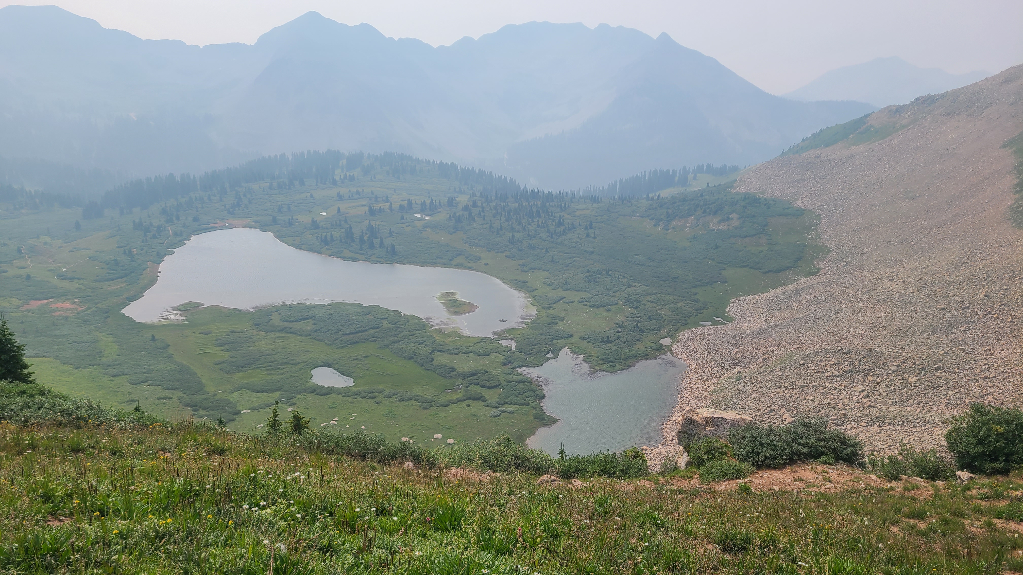 As I descended the rocky and sometimes sketchy trail down the other side, I was surprised to pass a large group of day hikers climbing up. They seemed excited despite their challenging climb; they turned out to be members of the North American Rock Garden Society on an annual outing to view their favorite plants in a natural setting. The haze only slightly detracted from the view of the San Juan mountains and Taylor Lake.
