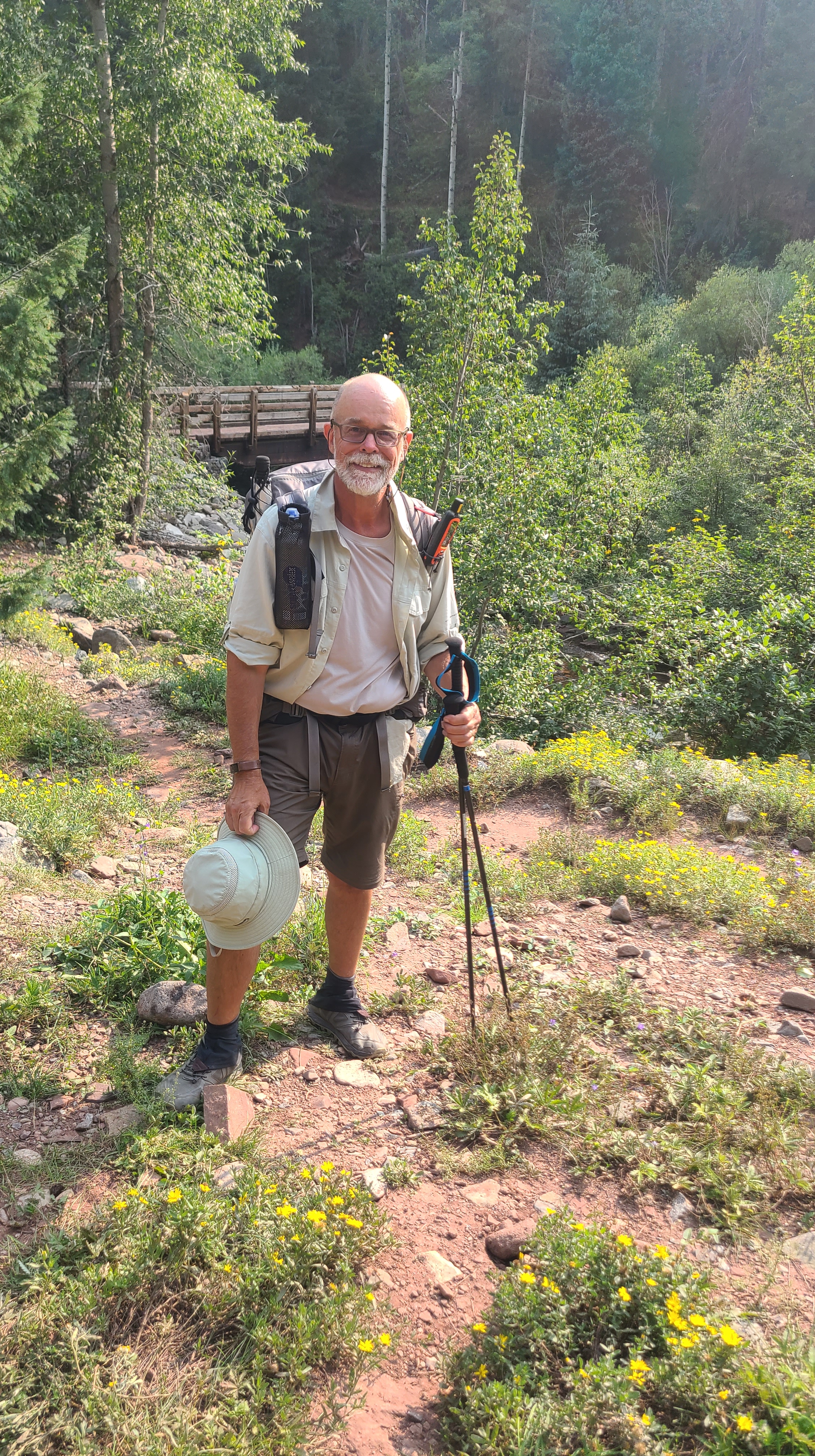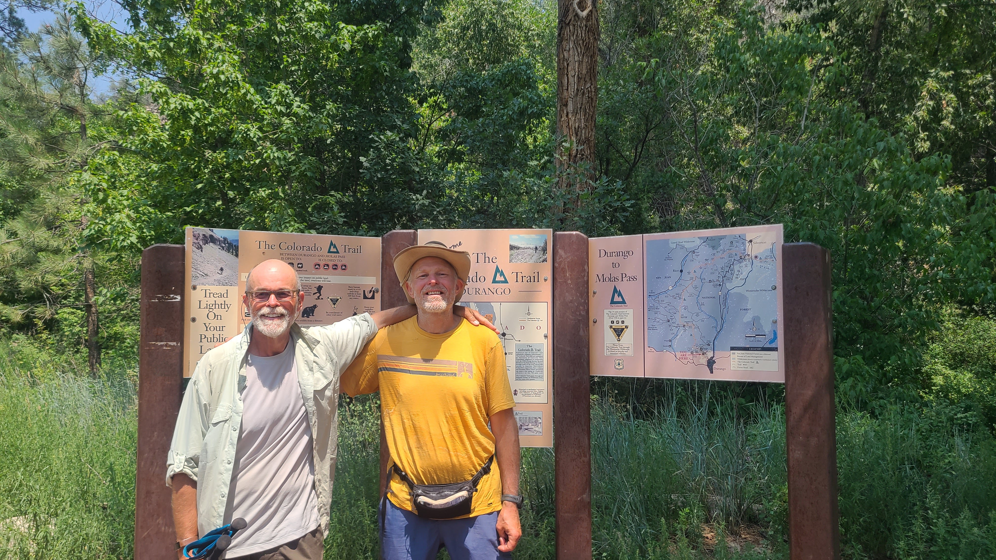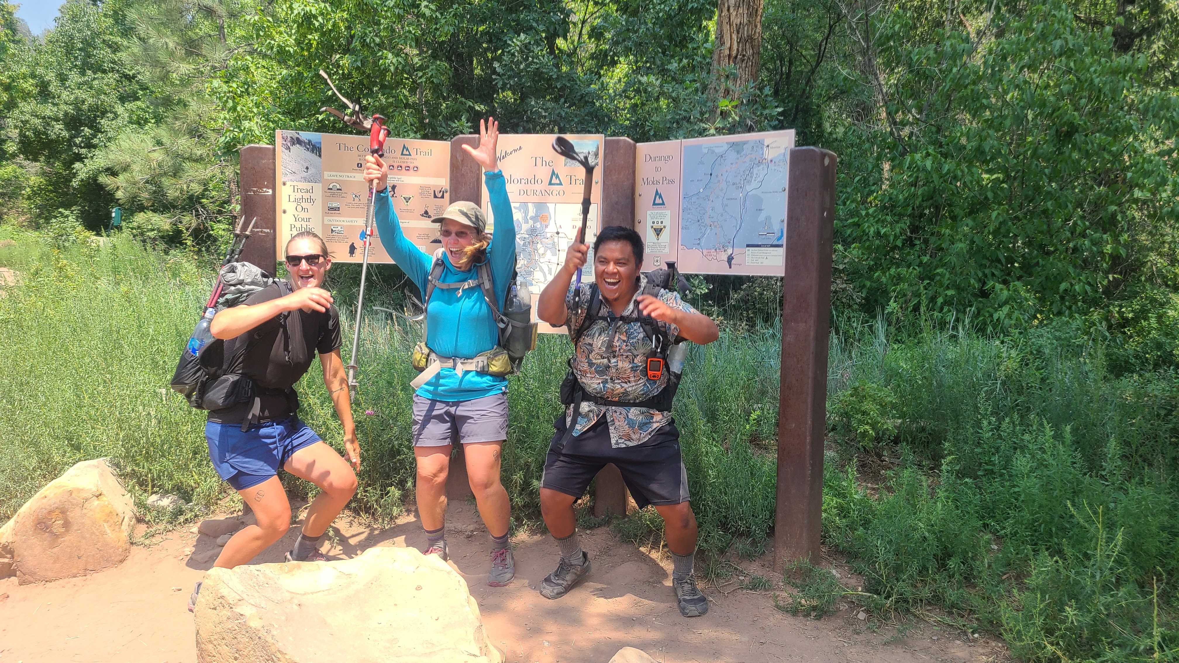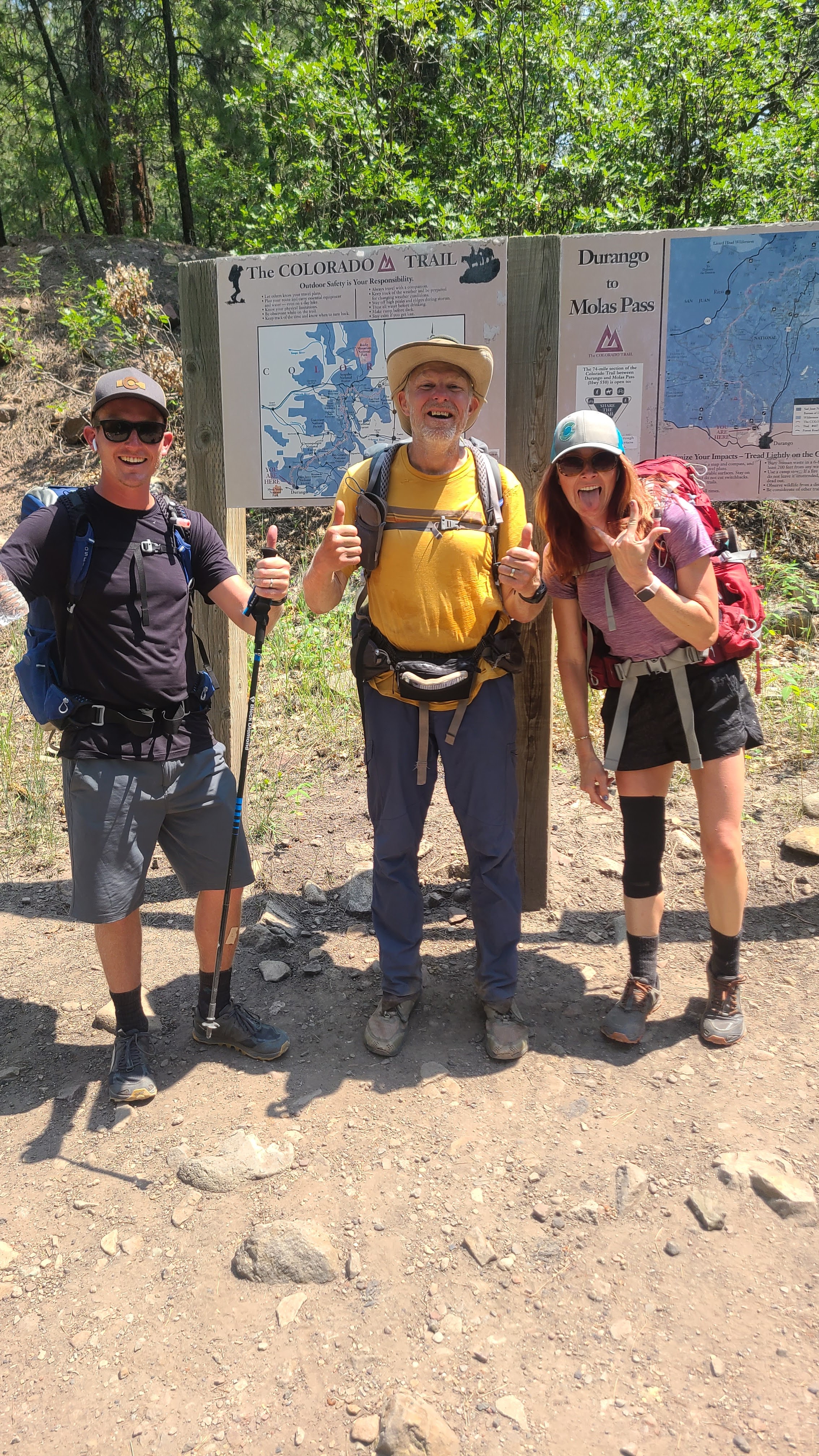 We had about 14 miles left the next morning, and I was looking forward to starting the last day with Kinnikinnick. Tacos was first on the trail, and Juicy Fruit charged past us as we made our last big climb. Kinnikinnick and I leap frogged after sharing the climb up. Butters and Coozy caught up and we shared the joyful last mile to the Durango terminus. Then came Flame, Waves, and Gadget, with Kinnikinnick not far behind. I was happy to have cell service to share the moment with my son Erik after all he had done to help me realize my dream.