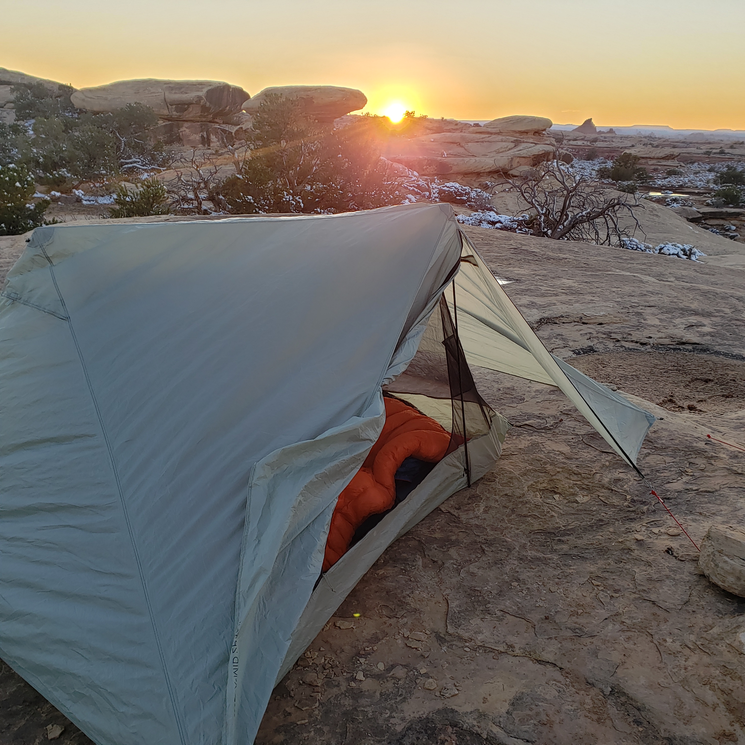 The next morning I thought that maybe just sleeping in my truck might have been a better option, until I realized my truck doors were completely iced over. I had to boil a couple pots of water to pour over the ice before I could open my truck door. I waited for the sun to come up over the rocks behind our camp site to break down my X-mid, and as advertised the silpoly material had not absorbed water despite the intense storm.