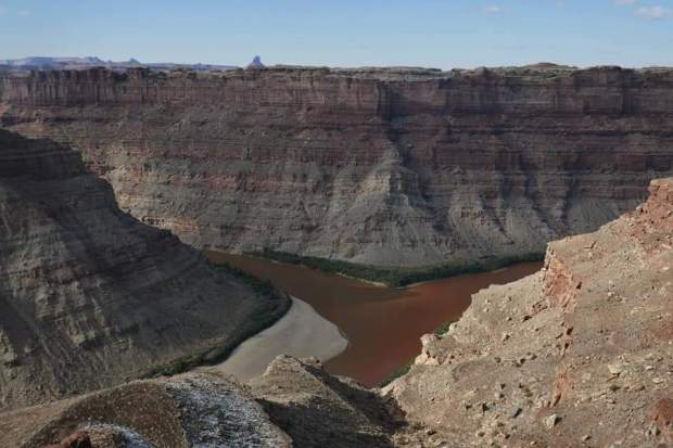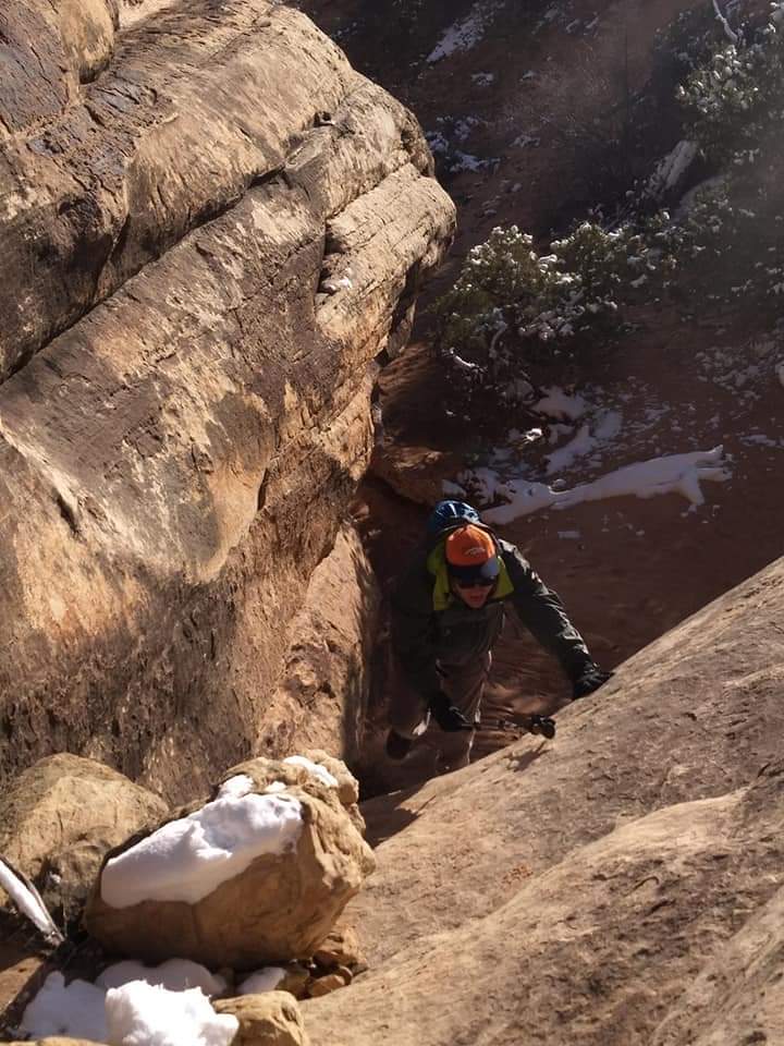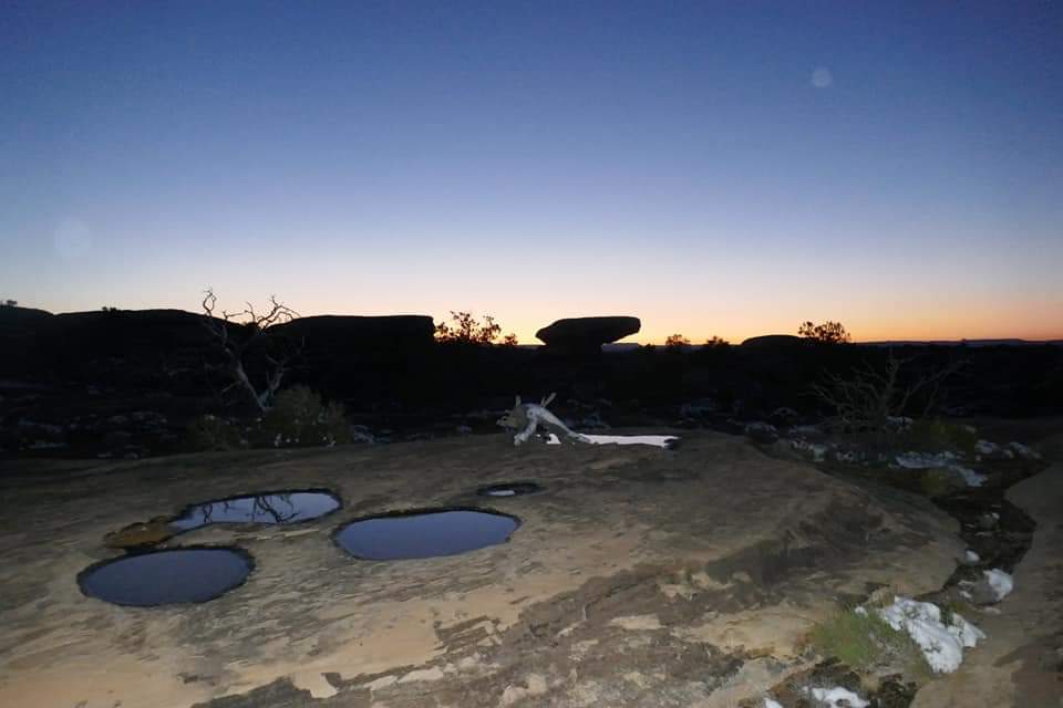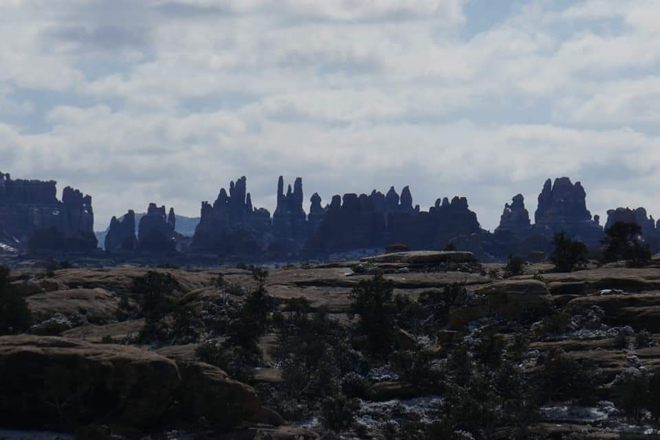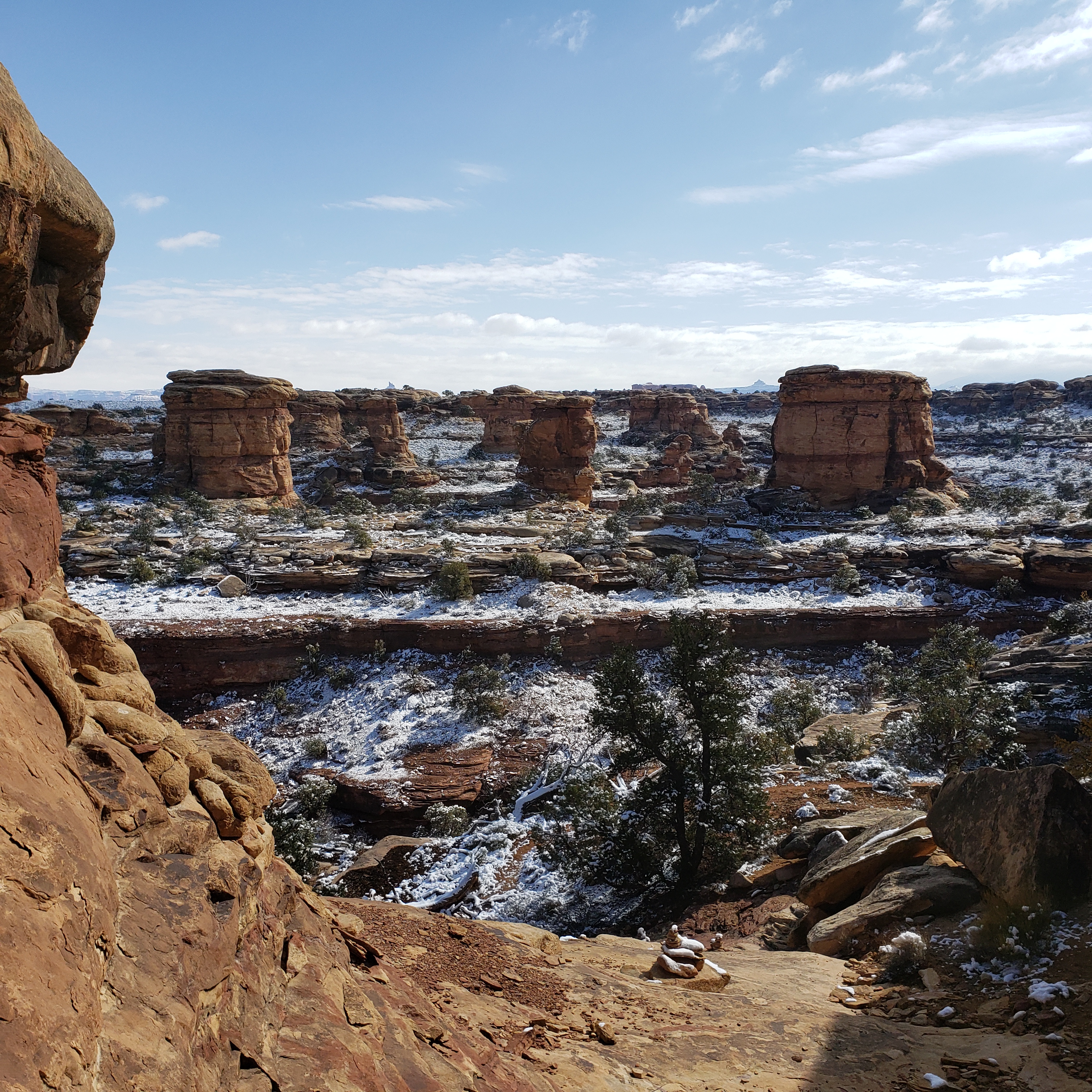 We parked at the Big Spring Canyon trailhead and entered with a Needles North at-large backpacking permit. These sites can be reserved at recreation.gov . We had also packed in wag bags as you have to pack out your poop & paper in the Canyonlands. We carried in about 2 gallons each of water, but on this trip there was plenty of water in the slickrock potholes thanks to the snowstorm. Rangers had let me know in a planning call ahead of the trip that the Colorado River was not really accessible from the Confluence Overlook, and that the silty river was a filter-killer anyway.