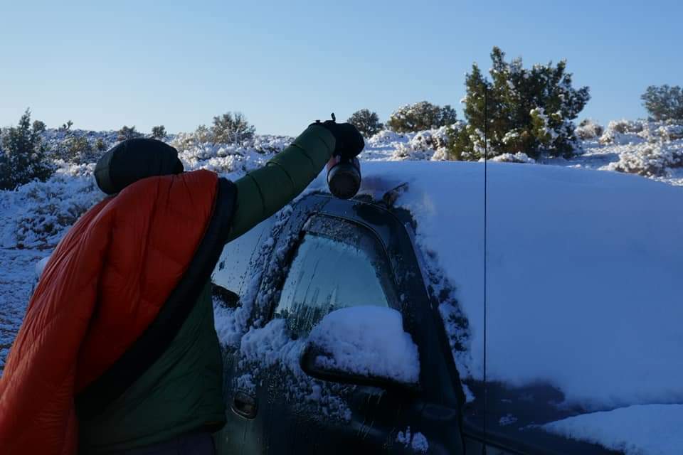 I arrived at the Canyonlands a bit later in the afternoon than expected so we decided to car camp the first night at a dispersed sight not far off the road to Big Spring. That turned out to be a fortunate choice, as just as I began to set up my tent a light rain quickly turned into a blowing wet snow storm. My rain jacket wetting out almost immediately. I had only set up my X-mid one other time camping under perfect conditions; the inner and rainfly pack up attached and the tent blew about wildly as I tried to stake the corners. As this was my first time setting up a trekking pole tent in the red Moab sand, I hadn’t even thought about the need for sand stakes. My “ultralight” tent stakes were pretty worthless that day, especially with the relentless wind and rain. I thankfully had plenty of extra shock cord in my truck to tie some sturdy, longer guy lines that I could use to anchor my tent to big rocks. I finally did get the tent set up, and was impressed at how well it held up during the overnight ice storm.