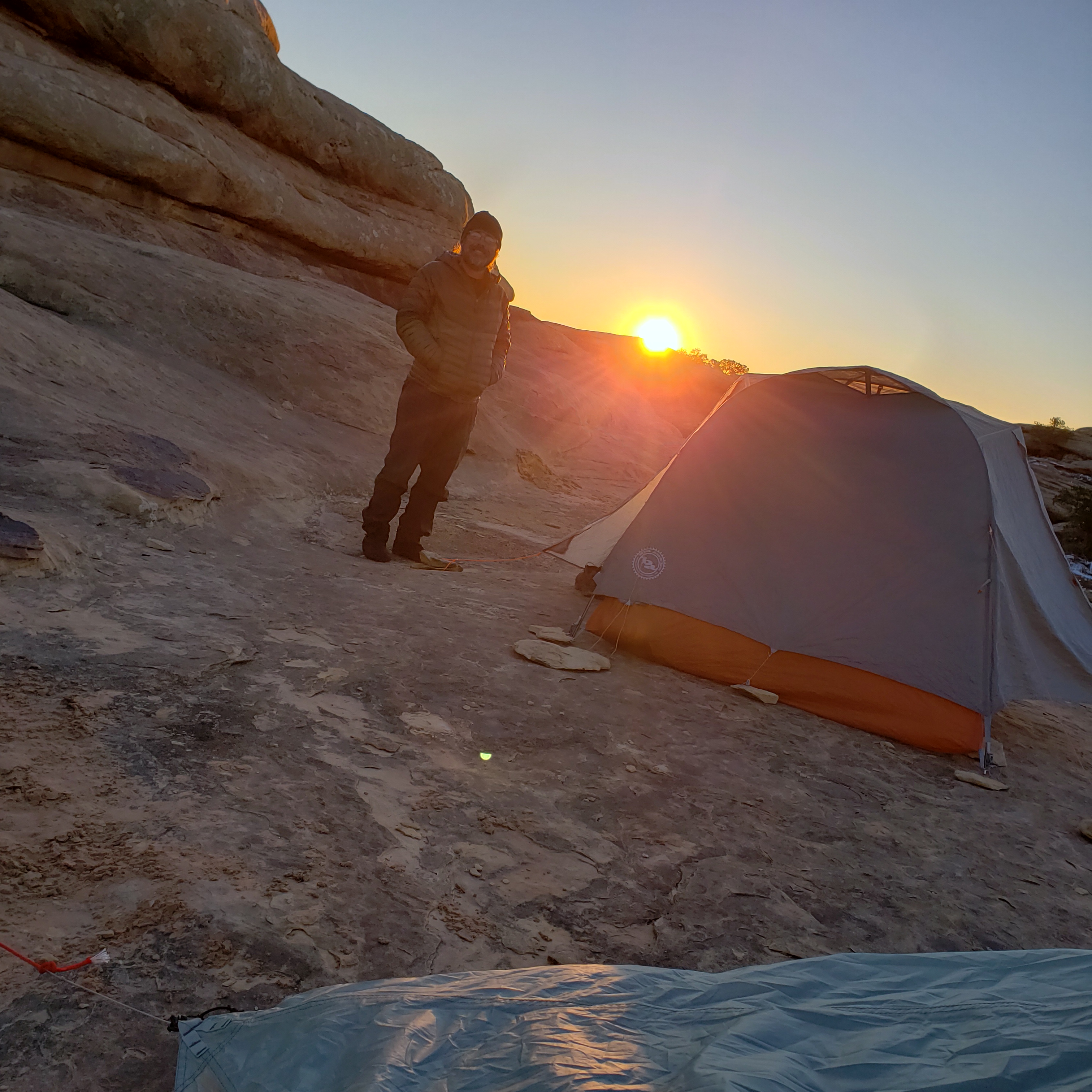 The hike down, then back up Big Spring Canyon with our backpacks was not easy but served as a good confidence builder. We had decided to set up camp early and found nice area on the slickrock out of site of the trail, then slackpacked to the Overlook. In our unexpectedly hectic morning I had forgotten to check that my phone had fully charged, and I didn’t realize until we were a couple miles in that I had less than 10% battery left. I had planned our route on GAIA and had it downloaded to my phone. Thankfully Chris had fully charged his phone and had the area map downloaded. In the end we were able to navigate our way to the Overlook cairn to cairn without too much difficulty, although it is definitely a good idea to hike this way with a partner to help spot the cairn markers. The route had some fun obstacles to climb up and down but nothing technical. We had agreed on a conservative turnaround time to allow plenty of time to get back to camp, and were happy to reach the Overlook a few minutes ahead of schedule.