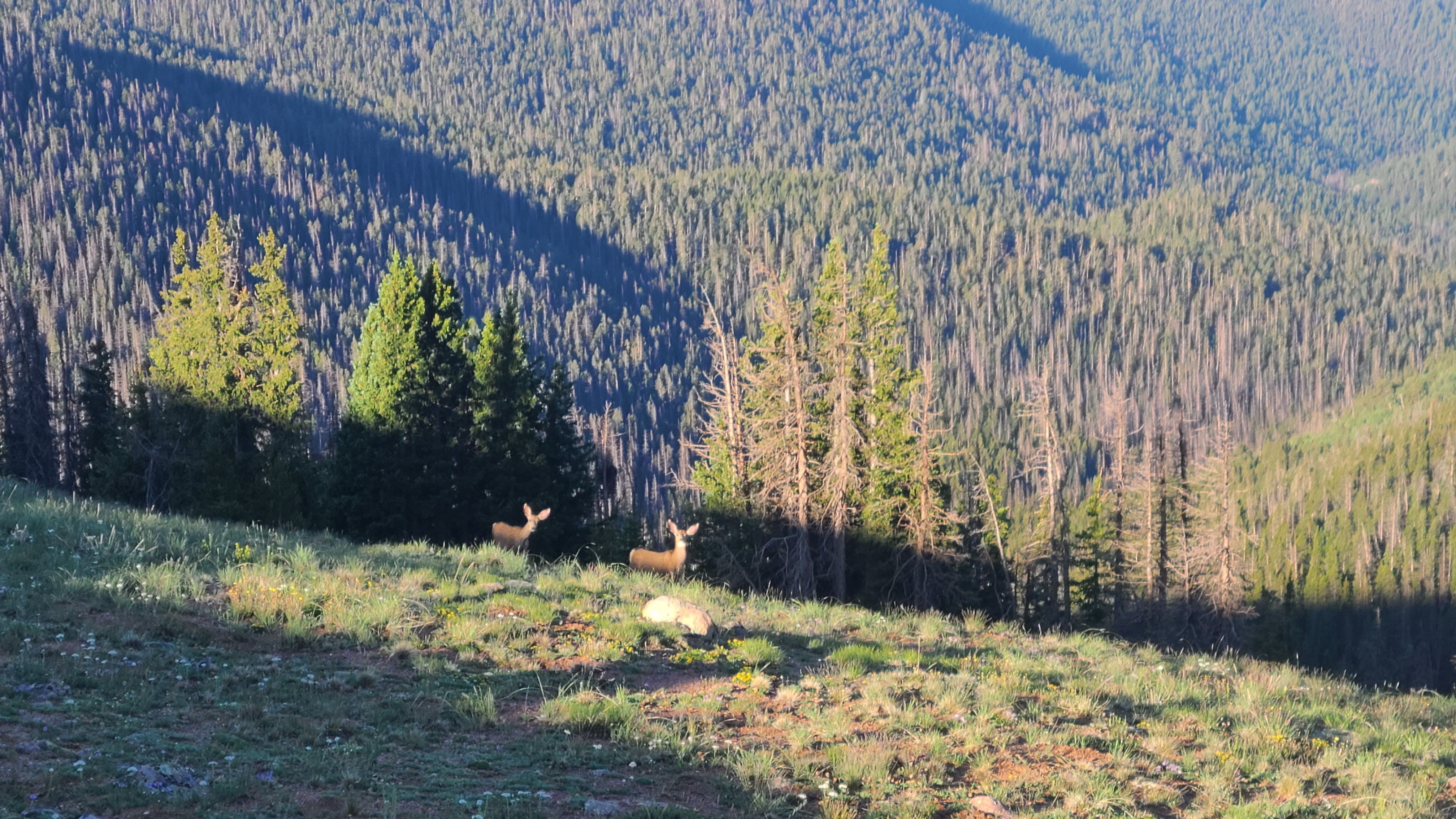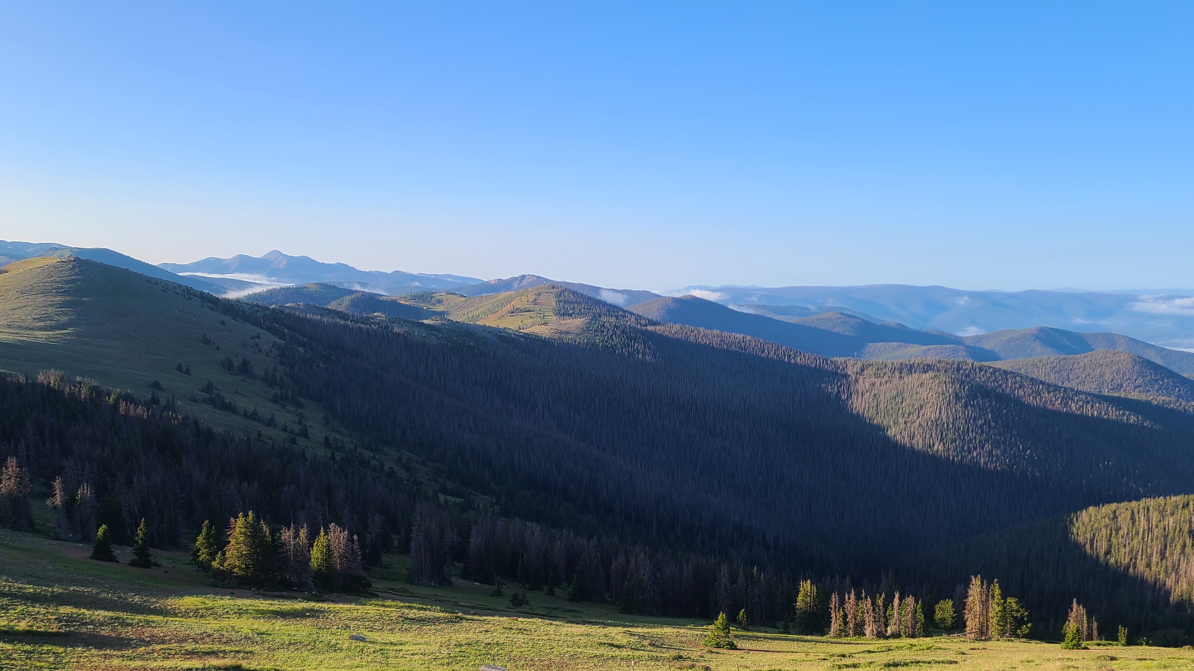 The alpine mesas and rolling hills were green and lush with all the rain we’d been getting. Rain looked likely today as well, and I tried to keep a good pace to get up & over to relatively lower ground before the thunderstorms hit. I was a bit disappointed that I couldn’t hold off a pair of younger, faster hikers that easily passed me. At least they were friendly, I thought.